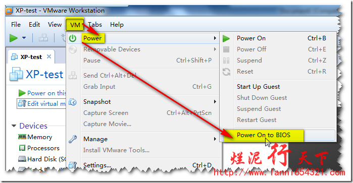 好了,以上是把U盘添加到了虚拟机中。那么接下来,我们就要设置启动时从U盘启动了。进入虚拟机的bios设置,“VM”→“Power”→“Power On to BIOS”如下图: