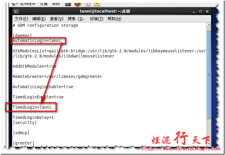 在[daemon]这一段中加入如下内容,其他内容保留。注意AutomaticLogin和TimedLogin后面跟的是你希望自动登录的用户名。