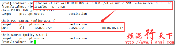 -A POSTROUTING -s 10.8.0.0/24 -o em2 -j SNAT –to-source 10.10.1.17