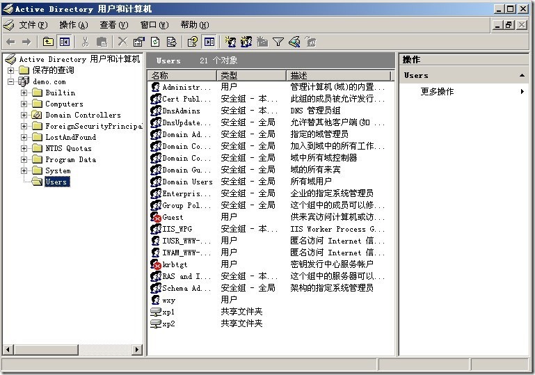这是我弄好的AD,在这里面我建立了新的用户:wxy。建立该用户的目的就是方便,在客户端操作。
