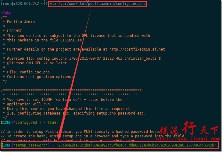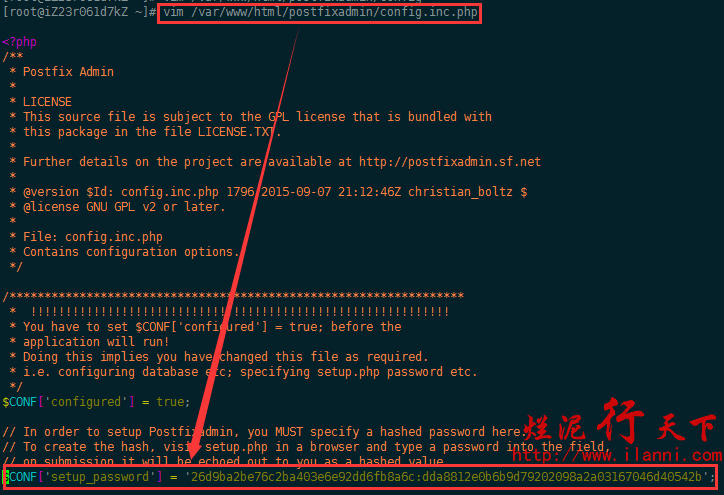修改完毕后,我们复制该密码到postfixadmin的配置文件,将原来的changeme替换成功现在的加密后的密码即可。如下: