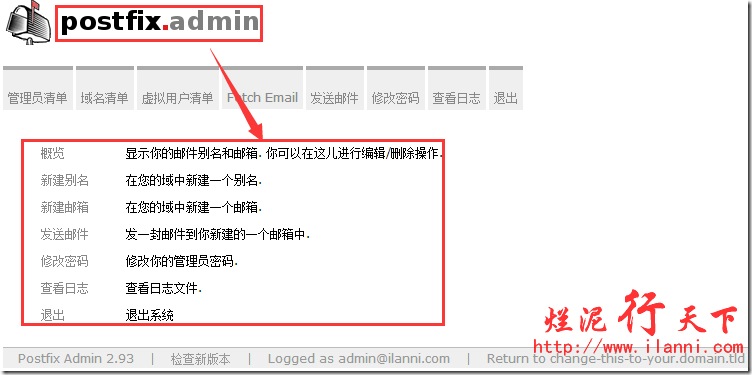 现在我们来使用这个管理员登录看看后台,后台登录地址为http://mail.ilanni.com/postfixadmin/login.php