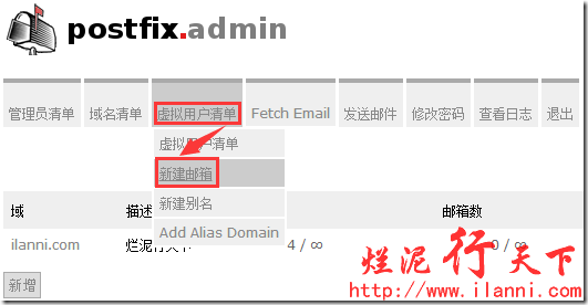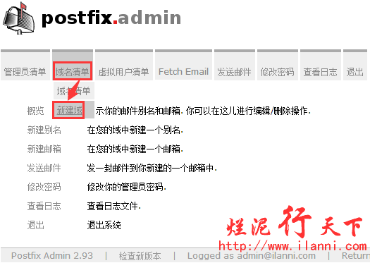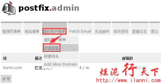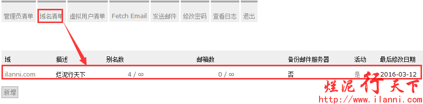 postfixadmin是支持多域名管理的,在此我们先添加一个域名ilanni.com。如下:
