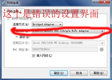 2.查看虚拟机的网络连接方式,这个没错是BridgedAdapter,界面名称Atheros AR9285