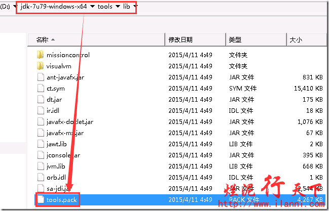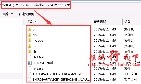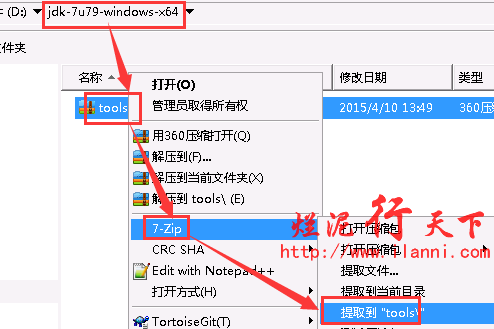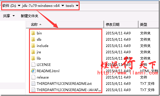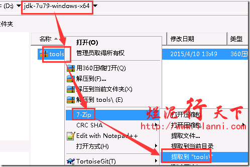 解压完毕后,会产生一个jdk-7u79-windows-x64文件夹,切到该文件夹下,会发现有一个tools.zip文件,继续解压,如下: