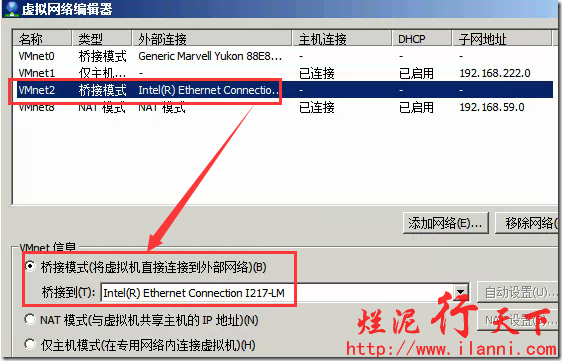 然后我们再添加一个新的网卡VMnet2,并且把VMnet2桥接到宿主机的本地连接2,即内网网卡。