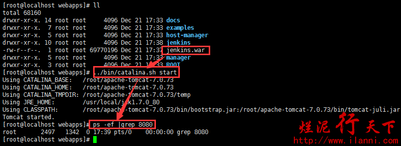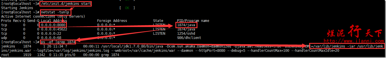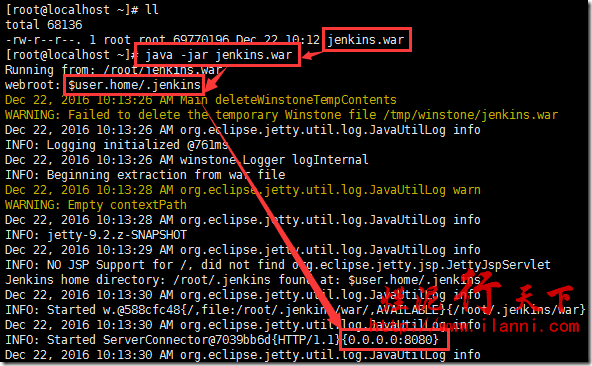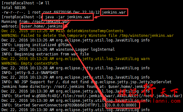 在2.3章节中,我们使用tomcat方式启动jenkins,其实我们也可以使用java命令直接启动jenkins,如下: