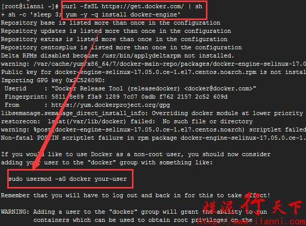 如果我们想让普通用户也具有使用docker权限,只需要把该用户添加到docker用户组即可。现在以ilanni这个用户为例,如下: