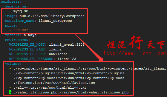 上述的docker-compose.yml文件中,我们创建了两个容器ilanni_mysql和ilanni_wordpress,其中- ./data:/var/lib/mysql的意思是把容器中的/var/lib/mysql目录映射到本地的data目录下。