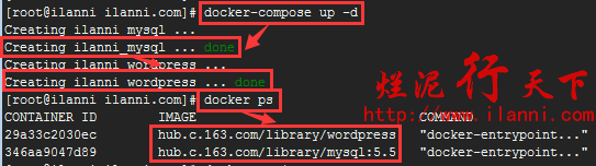 通过上图我们可以很明显的看出,ilanni_mysql和ilanni_wordpress这个容器已经创建完毕。