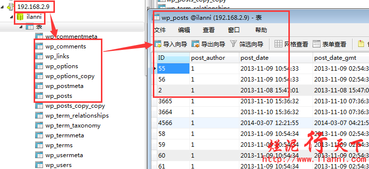通过上图,我们可以看到wordpress数据已经被恢复到新的数据库ilanni_mysql中了。