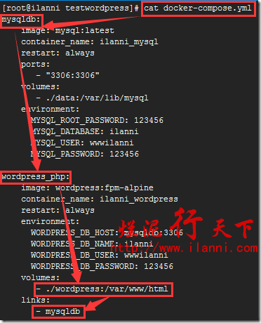 对于这个docker-compose文件中,我们定义了mysqldb、wordpress_php和web,这三个docker容器。