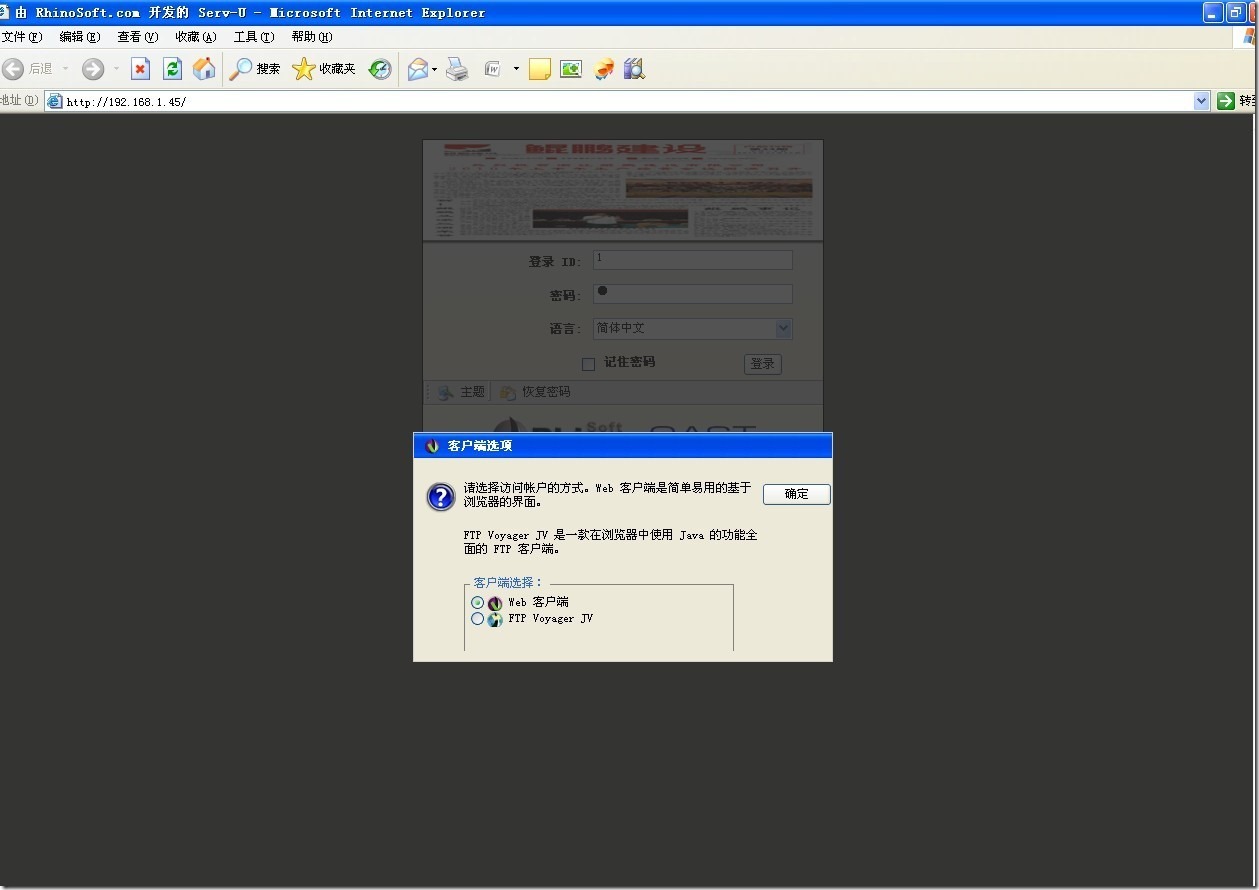 这个是server-u自带的欢迎界面和询问你,是通过web界面登录还是它公司开发的FTP客户端登陆。我们现在选择web界面的。登陆进去后,提示如下: ![]()
