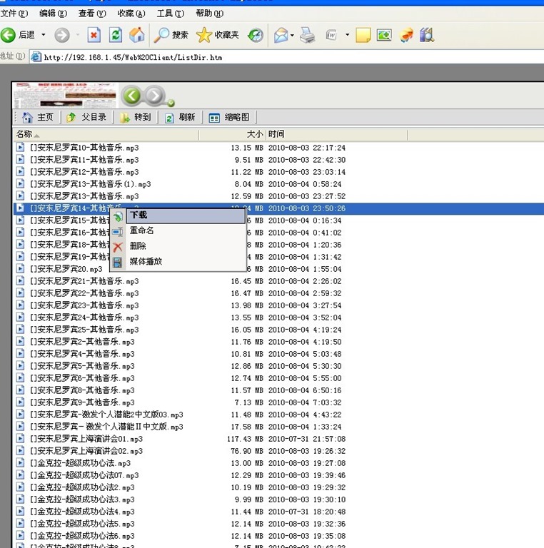不知道,你注意没有注意,在这个截图的下方出现一排,按钮媒体播放,搜索,下载,重命名,删除等,而没有上传,新建等按钮,呵呵,这是为什么呢。嘿嘿,这是用户1权限的问题,帖子开始我就说了,我现在所建的用户没有权限,也就是说现在用户1只具有下载和浏览功能。现在出现的按钮中除了重命名和删除功能不能使用外,其他的媒体播放,搜索,下载都是可以使用的。