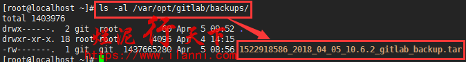 通过上图,我们可以很明显的看出备份后的文件是1522918586_2018_04_05_10.6.2_gitlab_backup.tar。