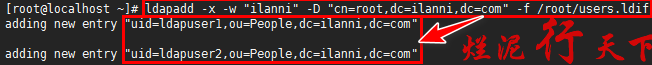 ldapadd -x -w “ilanni” -D “cn=root,dc=ilanni,dc=com” -f /root/users.ldif