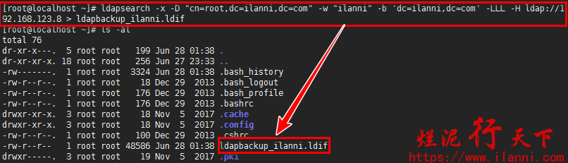 ldapsearch -x -D “cn=root,dc=ilanni,dc=com” -w “ilanni” -b ‘dc=ilanni,dc=com’ -LLL -H ldap://192.168.123.8 > ldapbackup_ilanni.ldif
