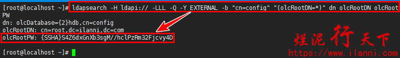 ldapsearch -H ldapi:// -LLL -Q -Y EXTERNAL -b “cn=config” “(olcRootDN=*)” dn olcRootDN olcRootPW