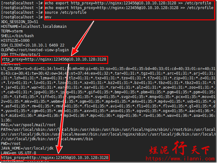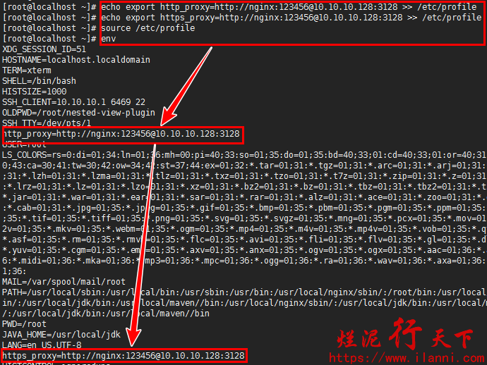 echo export https_proxy=http://nginx:123456@10.10.10.128:3128 >> /etc/profile