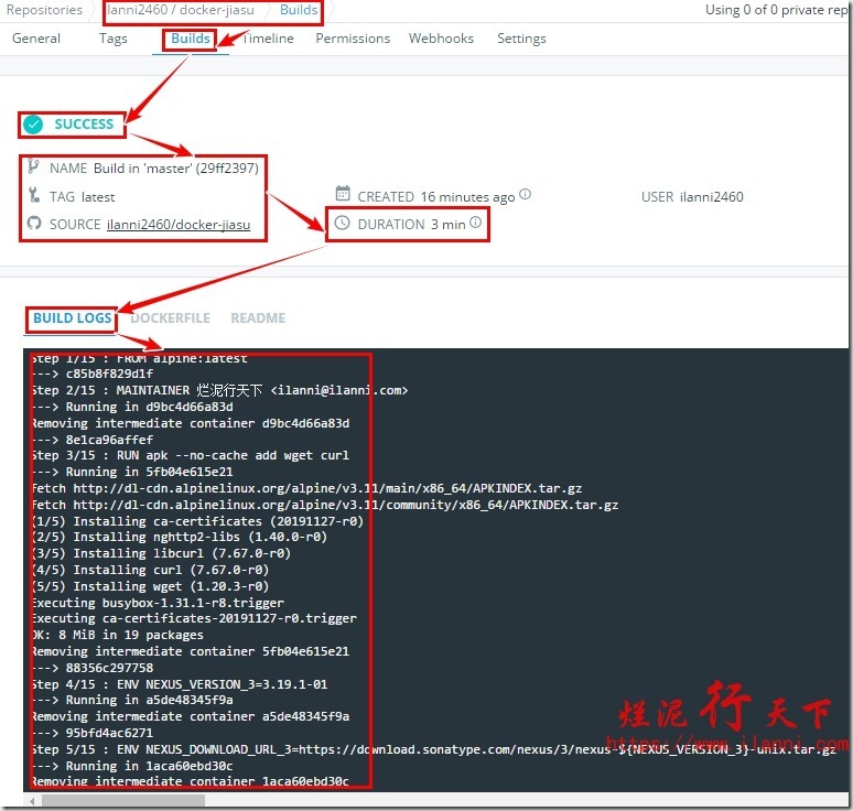 通过上图,我们可以很明显的看出dockerhub上已经构建成功。