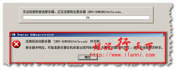 如果出现以上的界面,那说明我们的Domino Administrator已经和Domino成功建立连接了。但是此时,系统又会出现,如下的错误提示窗口: