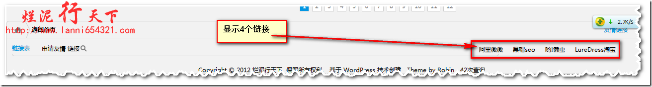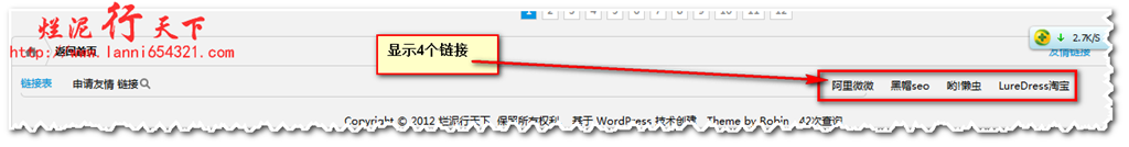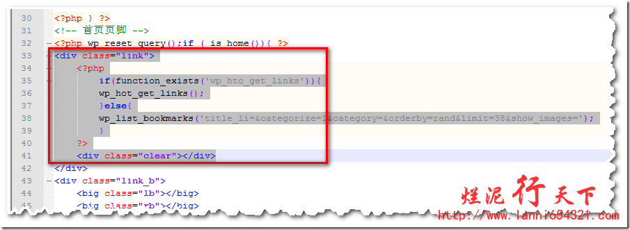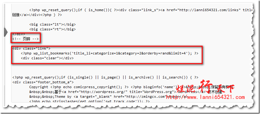 此代码中的category=2是链接分类的ID,orderby=rand&limit=4意思是随记显示4个链接。除此之外,我们还要删除以下代码,以免前台重复的显示链接。在“<!– 首页页脚 –>”下,找到以下代码,并删除: