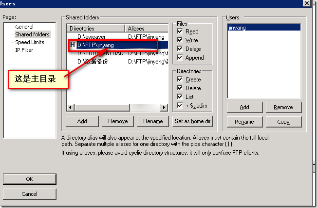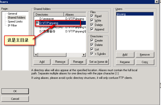 目前FileZilla Server最新版本已经不支持上面的配置,现在最新配置是“/+别名”,如下: