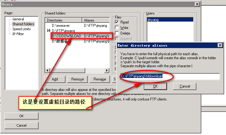举例:FileZilla Server的根目录(即Home目录)设为D:\FTP\jinyang\,现在要将D:\TDDOWNLOAD加入虚拟目录,则第一步添加新目录D:\TDDOWNLOAD ;第二步在已添加目录项D:\TDDOWNLOAD单击右键,选择edit alias(别名),设置alias为D:\FTP\jinyang\alias-name。其中alias-name为虚拟目录名,可以与实际的目录名(如D:\TDDOWNLOAD)不同。