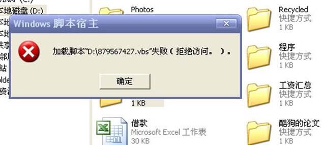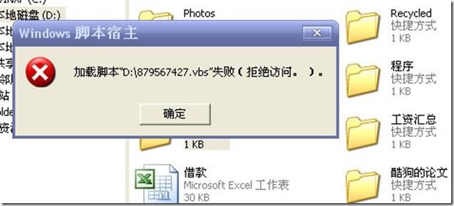 这哪是机器,就是一个活生生的病毒窝嘛。唉,没办法了。先打开试试文件能不能打开,靠,试了几次连文件夹都不能进去,出现如下提示:
