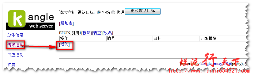 首先、我们也是要进入kangle代理服务器的控制台,找到“请求控制”→“插入”: