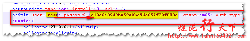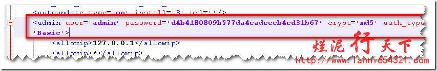 在config.xml中找到如下的代码:<admin user=……crypt=’md5′ auth_type=’Basic’>