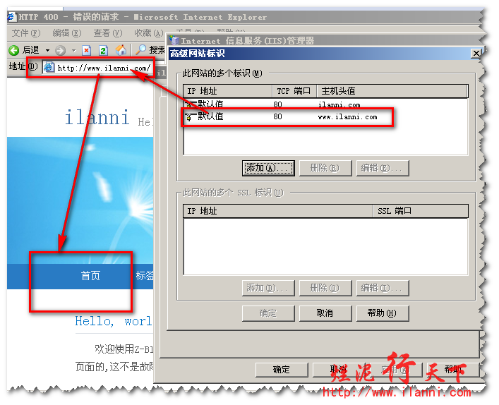 可以看到,我们现在是无法访问的。那么我们现在把www.ilanni.com这个主机头添加进去,如下图: