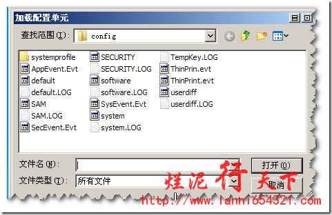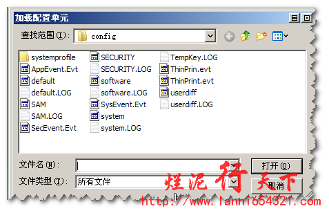 现在我们定位到你原来系统的文件夹,一般是C:\WINDOWS\system32\config,这个下面有好记文件,我们只需要选择“system”文件即可: