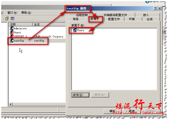 Ok,以上设置完毕后。我们现在在Windows系统中添加一个新的用户,让其访问FTP试试,看看能否访问。注意此用户必须是属于Users组,否则根本就无法访问FTP。如下图: