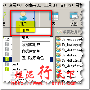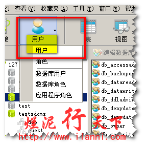 数据库及用户新建完毕之后,我们就要对用户赋予其相关的权限,才能管理其下的数据库。选中我们刚刚新建的数据库“tes”,点击面板上的“用户”选项,相中“数据库角色”,如下图: