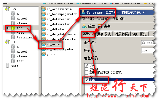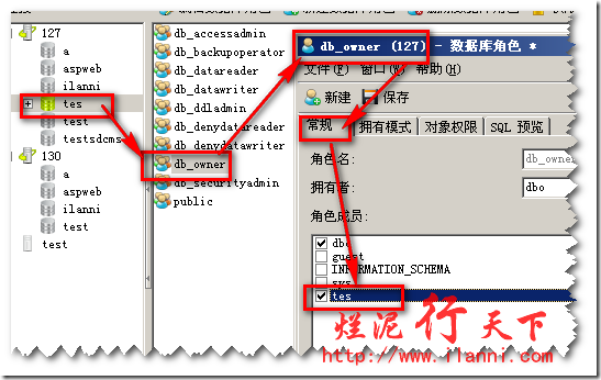 在新的界面中选择“db_owner”,这个是数据库的拥有者权限。双击,在弹出的新窗口选中我们刚刚在前面新添加的用户“tes”,然后点击“保存”,这样权限就赋予完毕了,如下图示: