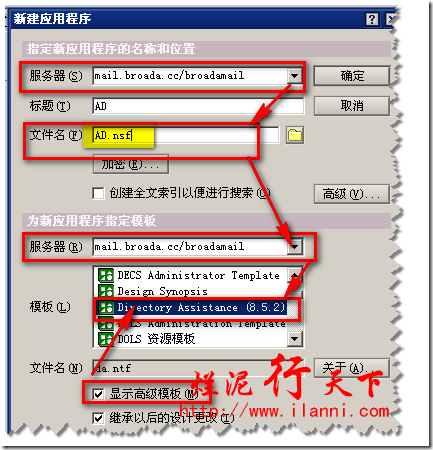 在弹出的窗口中填入相应的信息,“模版”一定要选择“Directory Assistance”:
