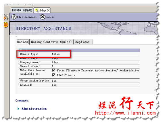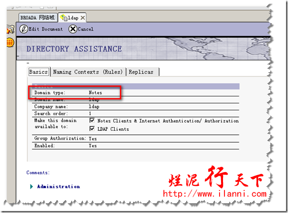 我们点击“Add Directory Assistance”来添加一个目录数据库。在“Domain type”中一定要选择“Notes”,其他的按照如下图的选择即可。