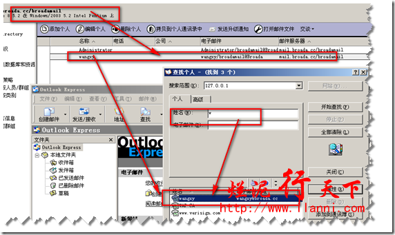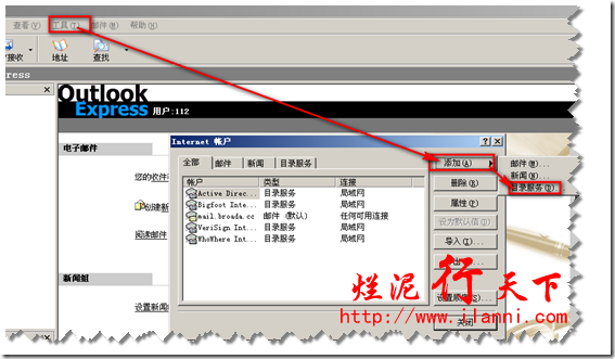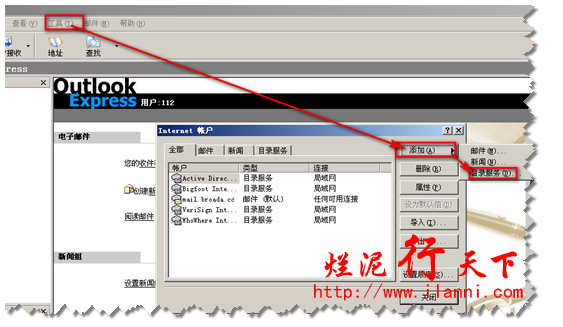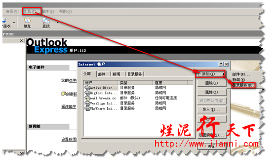 以上配置完毕后,我们先来测试LDAP是否正常工作。启动outlook express,点击“工具”—“账户”—“添加”—“目录服务”,如下图: