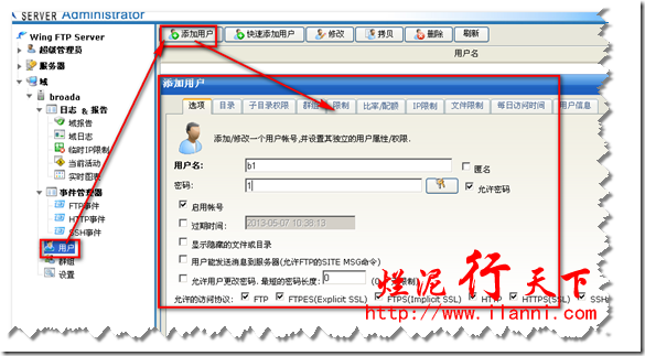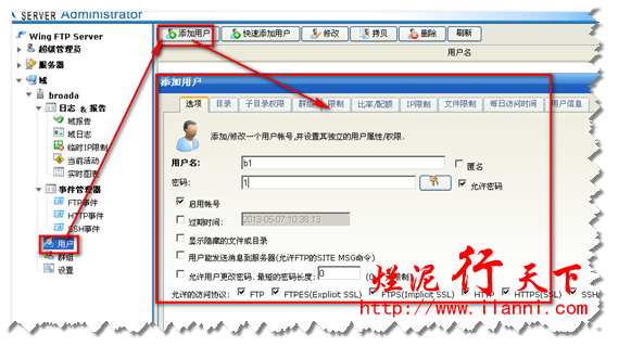 那么在WingFTP中,我们也是可以实现的。但是在Server-U FTP及Xlight FTP均不能实现此功能。在具体设置过程中,牵涉到几个用户一个是WingFTP中的用户即本地用户。另外就是Domino的用户及Domino中的用户组。