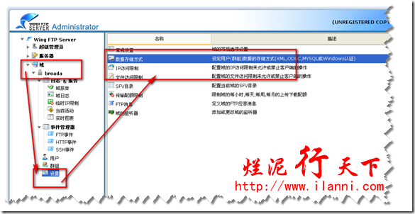 以上我们完成了WingFTP的配置,接下来我们来进行设置WingFTP使其与Domino进行集成。点击“broada”域,找到“配置”—“数据存储方式”,如下图: