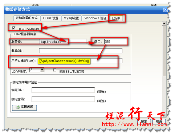 在“服务器”选项中填入我们的LDAP服务器的地址,现在是“ldap.broada.cc”。“端口”默认的是“389”。在用户过滤中一定要注意,其填写的形式是:(&(objectClass=person)(uid=%s))