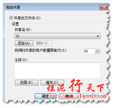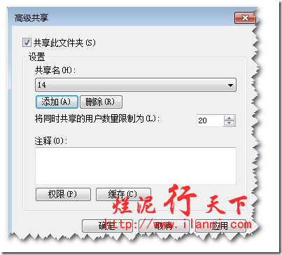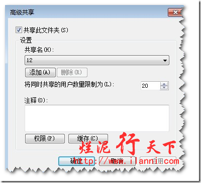 原理是:假如A文件夹共享,那么它只能被20个用户同时访问,但是通过“高级共享”选项中的设置,把A文件夹以另外一个名字出现,假如是B,那么现在B可以同时被很多用户访问了(具体多少,需要你自己去定义了)。