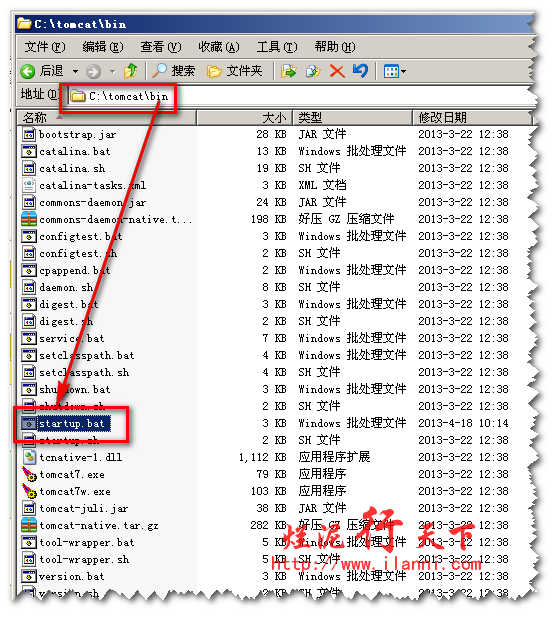 然后我们现在来配置Tomcat的相关JAVA设置。打开Tomcat下的bin目录找到startup.bat文件,如下图: