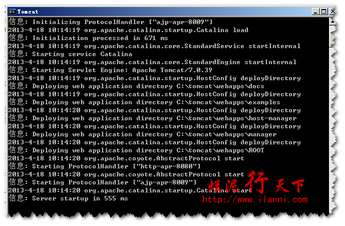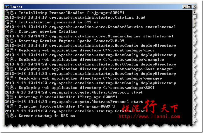 这个设置好后,我们就可以正常启动Tomcat了。双击startup.bat文件,启动后的界面: