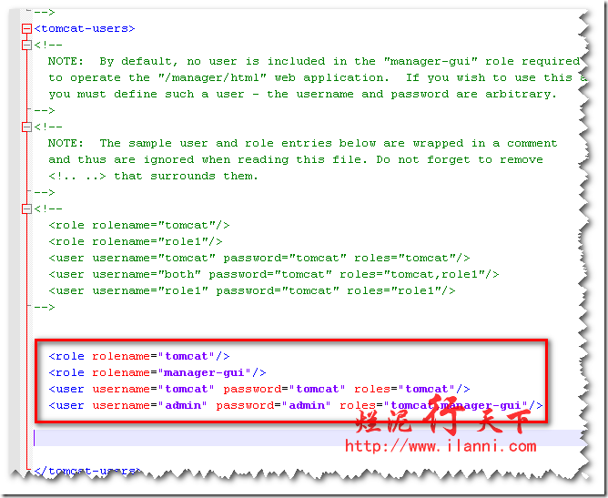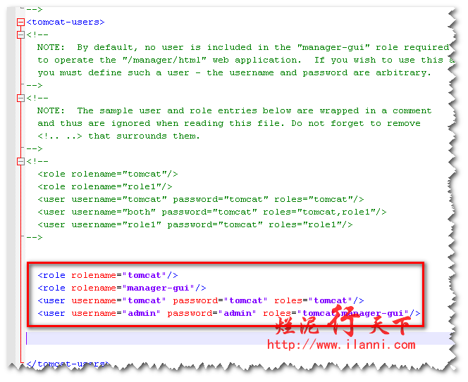 如果要登陆Tomcat的后台的话,我们还需要修改Tomcat目录下的conf文件夹下的tomcat-users.xml文件。我们只需添加一下语句即可: