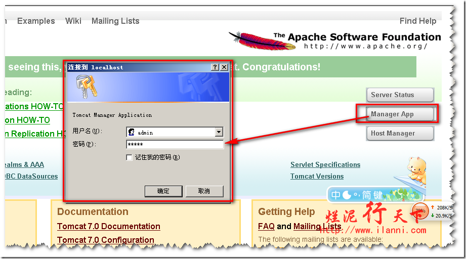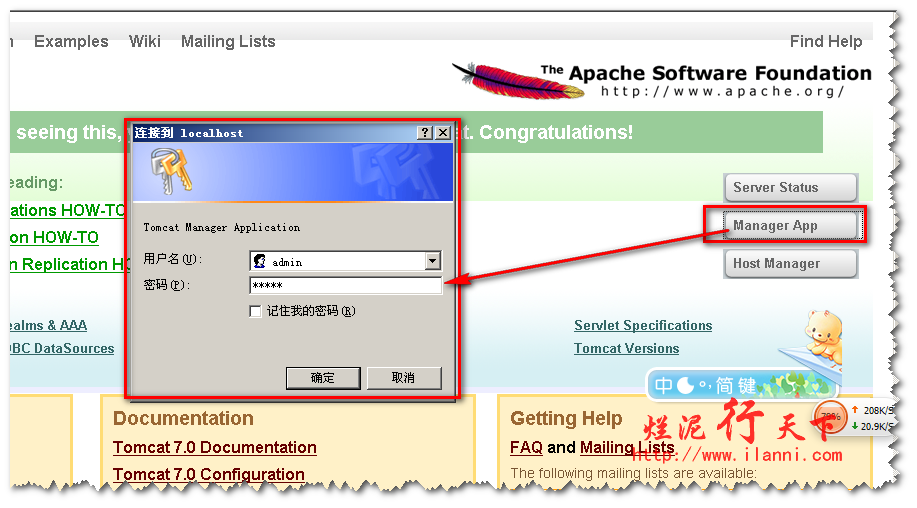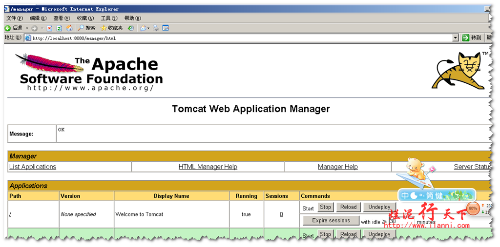 看到此界面说明,我们的Tomcat已经正常启动了。然后我们再点击“Manager APP”,输入我们刚刚配置的用户名及密码即可,如下图: