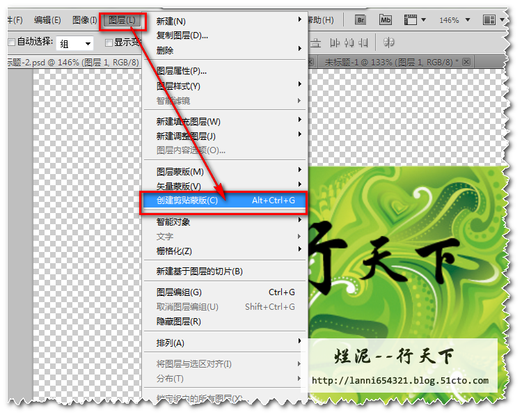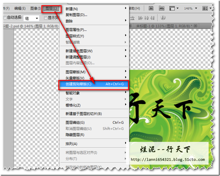 拖动好后,在文字的文件上选择“图层”→“创建剪贴蒙版”