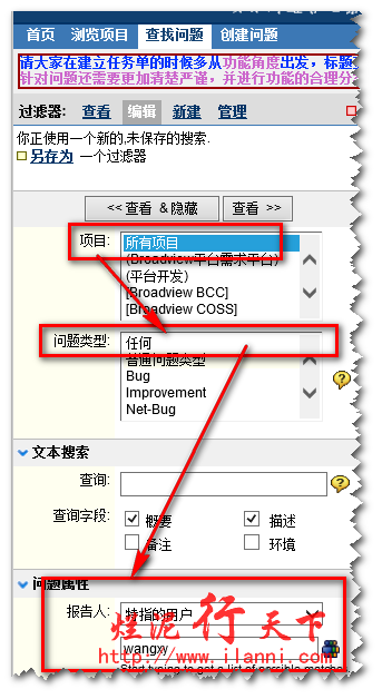 我们可以根据“项目名称”、“问题类型”、以及“问题报告人”等信息,进行搜索。