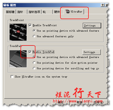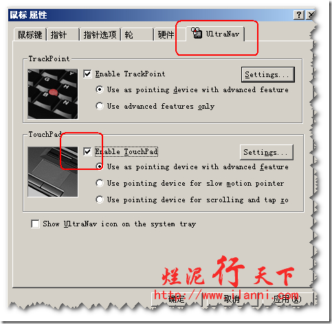 有些人的电脑看不到UltraNav,原因是少装了一个驱动程序,到联想的官网去下载“UltraNav鼠标驱动程序(Windows 7/Vista/XP) 适用机型: ThinkPad E40 ThinkPad E50 ThinkPad L412 ",装上以后就有这个选项了。
